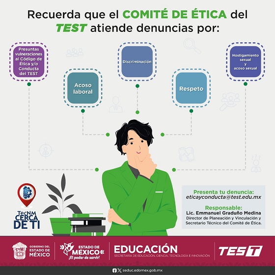 En atención al Programa Anual de Trabajo 2020 del Comité de Ética del TEST. Así como en cumplimiento a los artículos 1º fracción III de la Ley Federal para Prevenir y Eliminar la Discriminación, publicada en el Diario Oficial de la Federación el 11 de junio de 2003; 10, del Acuerdo por el que se emite el Código de Ética de los Servidores Públicos del Ejecutivo del Gobierno del Estado de México y sus Organismos Auxiliares, publicado en el Periódico Oficial “Gaceta del Gobierno” el 2 de abril de 2019; Apartado Vigésimo Séptimo inciso j) del Acuerdo por el que se emiten los Lineamientos Generales para establecer las bases de la integración, organización, atribuciones y funcionamiento de los Comités de Ética de las Dependencias del Poder Ejecutivo y sus Organismos Auxiliares, publicado en el Periódico Oficial “Gaceta del Gobierno” el 24 de junio de 2019; y de acuerdo al Capítulo 11, Apartado 9, incisos a),b), e) e i) del Protocolo para la Prevención, Atención, y Sanción del Hostigamiento Sexual en el Estado de México, publicado en el Periódico Oficial “Gaceta del Gobierno” el 24 de junio de 2019; les informo a ustedes, que en la Primera Sesión Extraordinaria del Comité de Ética y de Prevención de Conflicto de Intereses del TEST, realizada el 24 de mayo del 2018, ha quedado conformado el Subcomité de Hostigamiento Sexual y Acoso Sexual del Tecnológico de Estudios Superiores de Tianguistenco